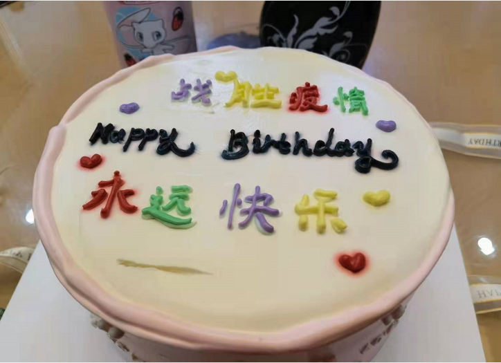 9日晚上,金凯同志给妻子订了一个特殊的生日蛋糕,蛋糕上写着“战胜疫情 永远快乐”。女儿看着蛋糕说到“我们一起把‘疫情’吃掉!”