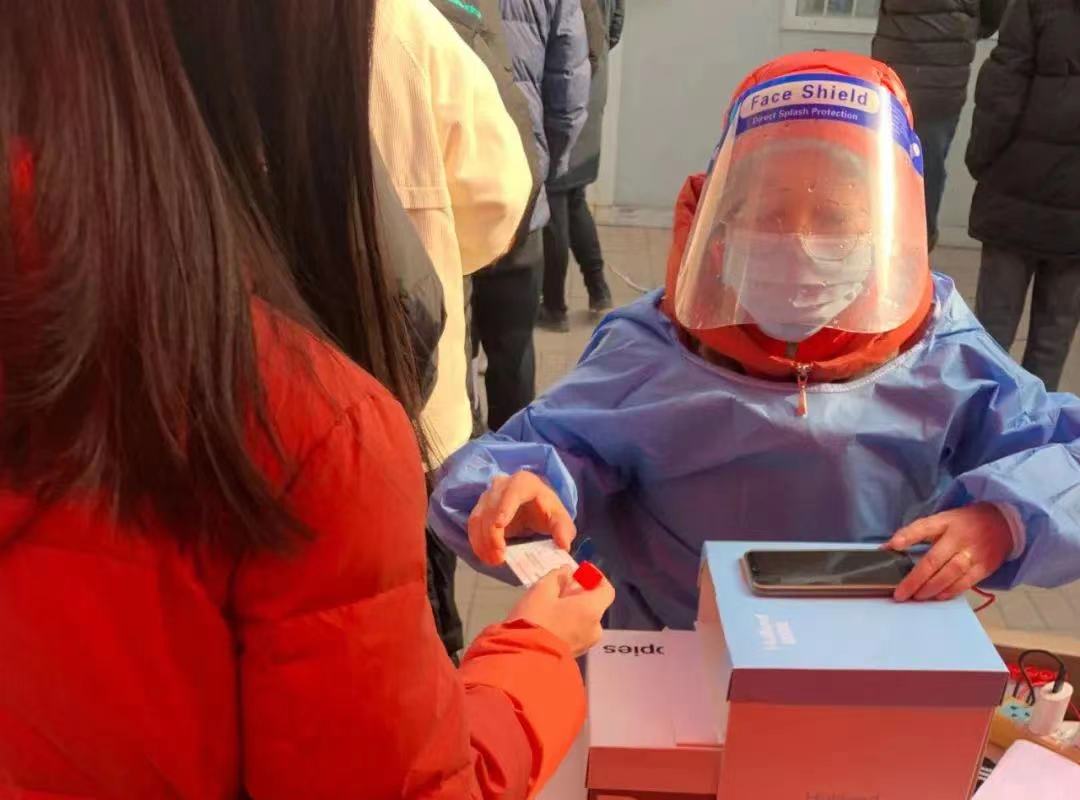 王改芝老师所在的津南区是此次疫情突发的主要区域,截至1月20日已经进行了9次筛查。她无惧困难,逆行而上,站在了抗疫一线。从负责挨家挨户登记居民核酸检测信息的楼筛队长,到陪同医护人员入户给100多个家庭核酸检测的“大白”,王改芝老师强忍腰椎颈椎的疼痛,从夜幕降临工作到东方破晓。第二天一早,她又号召自己的爱人接力,加入“知香园大筛”志愿服务大军,两人轮班组成抗疫“夫妻档”,共筑战“疫”长城;儿子也为一线医护人员送去“暖手水瓶”,为白衣天使带去温暖。在换班休息期间,王改芝老师又当起了“小程序楼筛负责人”,她详细统计每一户居民的具体情况,记录每一项特殊需求,她整理的“动员术语”被居委会工作人员列为了模板。连续几天的志愿服务虽然辛苦,王改芝老师却说:“虽然疫情来得突然,但只要我们团结一致,大家小家共同努力,就一定能够打赢这场战‘疫’阻击战。”