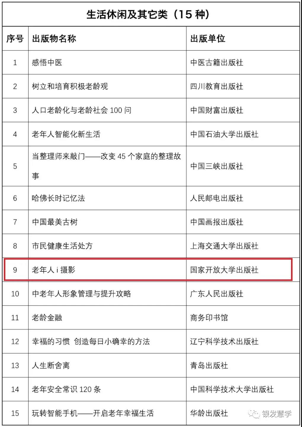 近日,由全国老龄工作委员会办公室、中国老龄协会、中国出版协会主办的“2021年向全国老年人推荐优秀出版物活动”已经完成了评审并公示了100种入选书目。安博官方网页版组织编写、国家开放大学出版社出版的《老年人i摄影》在全国1380种参评出版物中脱颖而出,成功入围和入选。