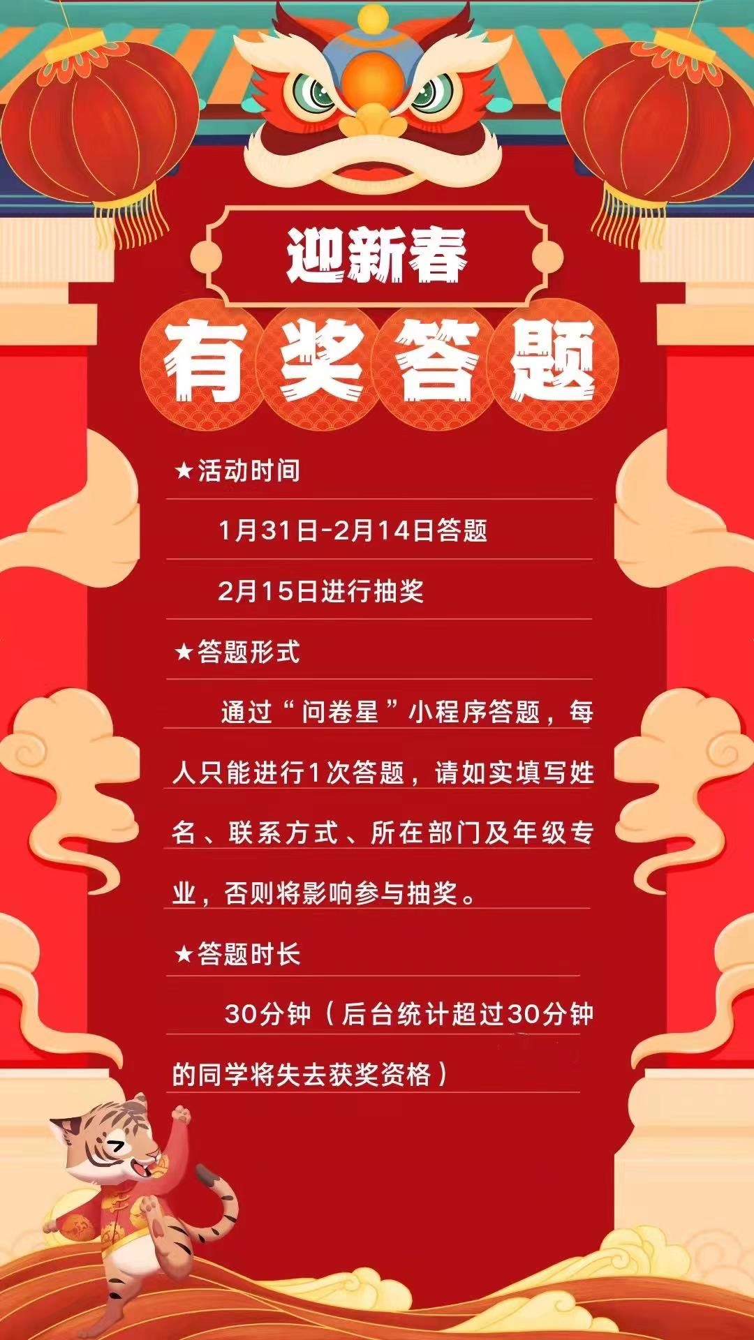 1月31日至2月16日,为营造欢乐喜庆、文明祥和的节日氛围,丰富学生节日期间的文化生活,安博官方网页版组织开展“迎新春”学生线上答题活动。