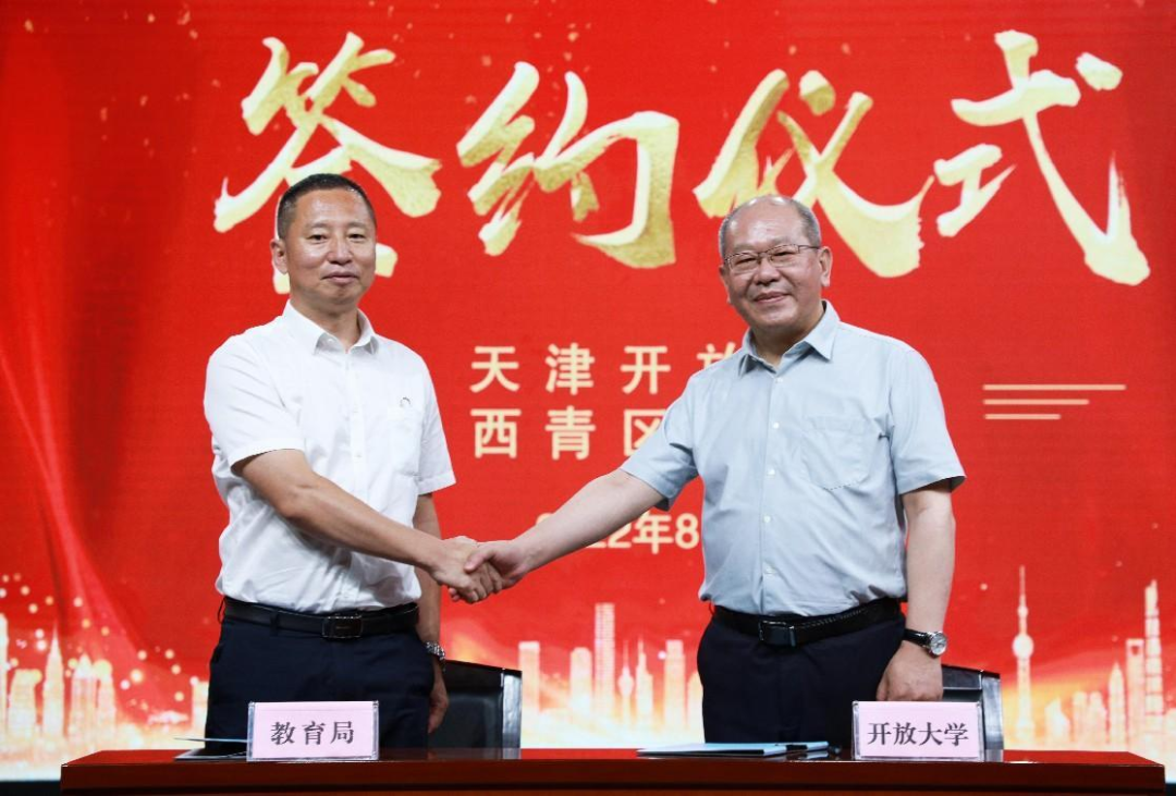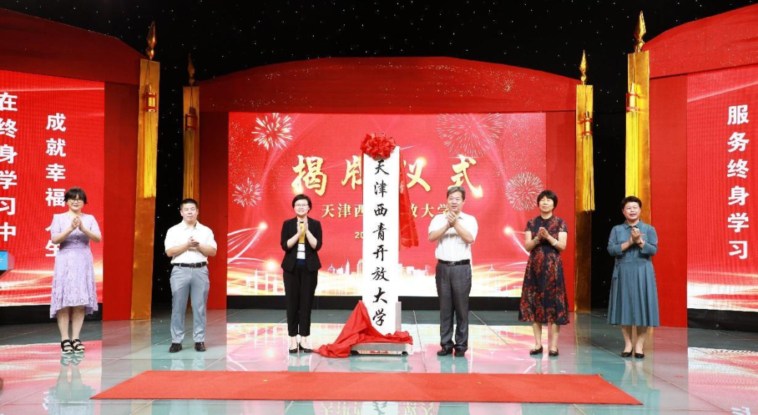 西青区人民政府办公室副主任刘海洋宣读了《中共天津市西青区委机构编制委员会安博(中国)天津广播电视大学西青分校更名的通知》。柴树芳副区长、张宗旺校长共同为天津西青开放大学揭牌。